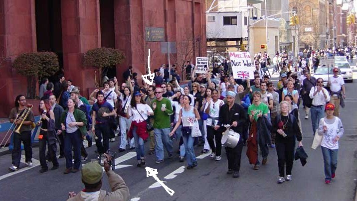 What else is there to say? Well, hell, I'll say it. On March 22nd, Marco and I attended the peace march in NYC. We brought along a tamborine and agogo bells. When the attack, err, war, was first announced, I became depressed and started to wonder what difference music makes, what difference ANYTHING makes. At our gig on the 21st, I changed the lyrics to a chorus of Hook In expressing my pro-peace sentiments and the audience cheered. That was answer #1. Answer #2 came the following day at the peace march. Marco and I fell into step with a drummer and later, a trombone player. Because we were playing music, the people around us were dancing and singing and smiling, and it was so much fun and I truly felt they appreciated that we were playing music. In fact, when we reached Washington Square Park, we found a drum circle and joined in, and a woman said to me, "Wow! You have great rhythm. You're holding it together. It's a good thing you're here" and then she danced away. It felt great and I remembered what music is for... to lift people's spirits, among many many other things. Marco found this picture on the internet. I'm in the blue number nine cap. We somehow ended up at the front of the march. If you're reading this and you think the war is a good thing, then you disagree with me and that's fine. If you want to talk about it, you know where to reach me.