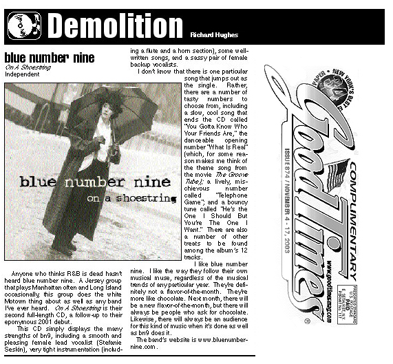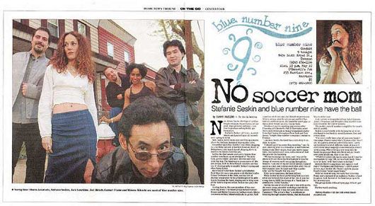 LIVE REVIEW from Pennsylvania Musician, "The Professor", September 2006 The Blair County Arts Foundation again presented the Summer Sounds of Jazz concert series on select Fridays at downtown Altoona‚s Curtin Mall. On July 28, New Jersey's blue number nine returned to dazzle a large audience with their bright blend of funk, jazz, R&B and pop sounds. Lead singer/flute player Stefanie Seskin and backing singers Camari Frame and Chris Vaindirlis blended for some bright and crisp harmonies; backed by tight grooves and sparkling musicianship from guitarist Luca Tozzi, bassist Marco Accattatis and drummer Jack Gourdine II. Highlights were numerous, as blue number nine performed original songs from their various albums. The group staged a limbo contest with audience members during their Latin-flavored "Dance Dance Dance;" Stefanie and Luca engaged in a flute/guitar duel during "Dig My Hands;" and Stefanie played the "Pied Piper" and led kids and audience members around the plaza during the group's closing number, "Love the Beat." Again, it was a remarkable performance, as blue number nine delivered a lively, entertaining show with stunning musical chops, choreographed movement onstage, enthusiasm and smiles. Look for this band to be back next year! CD REVIEW - "Living It Up In The New World" from Pennsylvania Musician, September 2006 (Check Other Records) Jersey City, New Jersey’s Blue Number Nine has been around for a full decade, forging their eclectic brand of jazzy, funky, upbeat, groove-infused music. Their latest album, “Living It Up In The New World”, offers a tasty cross-sectional representation of what all this band encompasses over its dozen tracks. Front and center throughout the album is lead singer, flute player and songwriter Stefanie Seskin, whose bright, expressive performance convincingly sells her thoughtful, observational and easy-to-digest lyrics. Complementing Stefanie is a stellar cast of musical talent; guitarist Luca Tozzi, bassist Marco Accattatis, and Jack M. Gourdine II on drums; also a corps of backing singers including Morgan Rose Fite and Amy Leeds, plus a horn section on several tracks. The tunes here offer a variety of flavors and moods, with something for nearly everyone. Listeners with the jones to cut the rug should enjoy the driving “Love the Beat” and the Latin-tinged “Dance Dance Dance” with its Miami Sound Machine flavor. Fans of instrumental fireworks and fusion will likely savor “Dig My Hands” (about gardening), “Castles” and the closing agitated 8-minute jam session workout “I’m In Debt.” For lighter and jazzier tones, there is “When I Wake Up,” and “Gimme More Time” offers a driving R&B flavor. Also present is Stefanie’s 9/11-inspired commentary “Never Felt That Way,” and her lighthearted account of a road-rage incident, “Turnpikes & Parkways.” All twelve tunes offer tasty and catchy melodies, smoothly executed with Stefanie’s spirited vocals and the group’s continually dazzling instrumental performances. Produced and engineered by Stefanie with Marco at Concussion Studios in Jersey City, “Living It Up in The New World” displays nice balance between the various components of Blue Number Nine’s sound; and the arrangements are varied and diverse enough to keep things interesting throughout. The bottom line – “Living It Up In The New World” offers ear candy with chops, and is a pleasant, captivating, fun listen. Blue Number Nine is clearly living it up here, and the listener is welcomed inside to enjoy the party. (The CD can be obtained through Blue Number Nine’s website, www.bluenumbernine.com.) —reviewed by Jim Price 06/19/06 - from the "Daily Record" newsroom Eclectic blue number nine has Morris dates this week